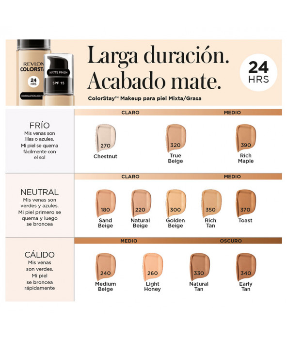 La base maquillaje ColorStay Makeup Liquid Oily de Revlon es una base de larga duración ideal para las pieles mixtas y grasas, que proporciona un acabado mate perfecto.